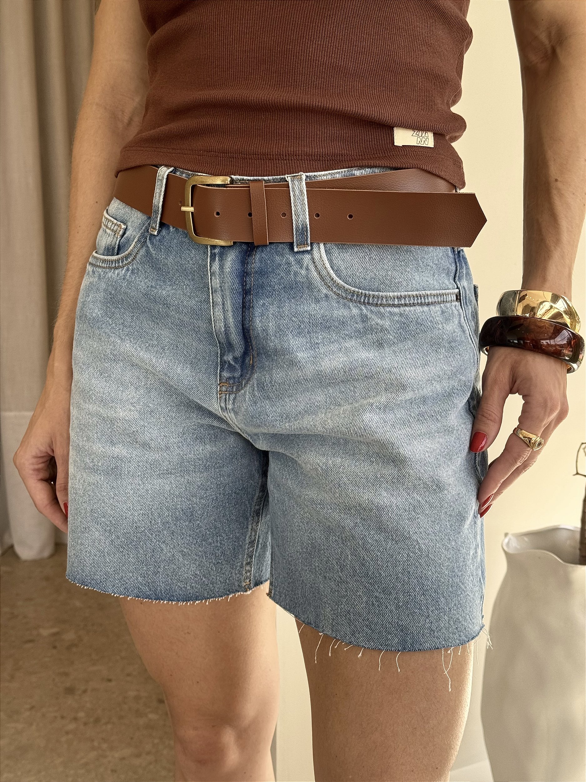 A Bermuda Suzan é confeccionada em jeans com lavagem média, trazendo aquele visual atemporal que nunca sai de moda. Possui cintura alta, cós com passantes e acompanha um cinto marrom largo, que é o grande destaque da peça e adiciona charme imediato ao look. O fechamento frontal por zíper e botão, os bolsos laterais e posteriores funcionais e a barra a lazer garantem praticidade e um ar moderno. Os detalhes de bigodes frontais completam o visual, deixando o jeans ainda mais estiloso.