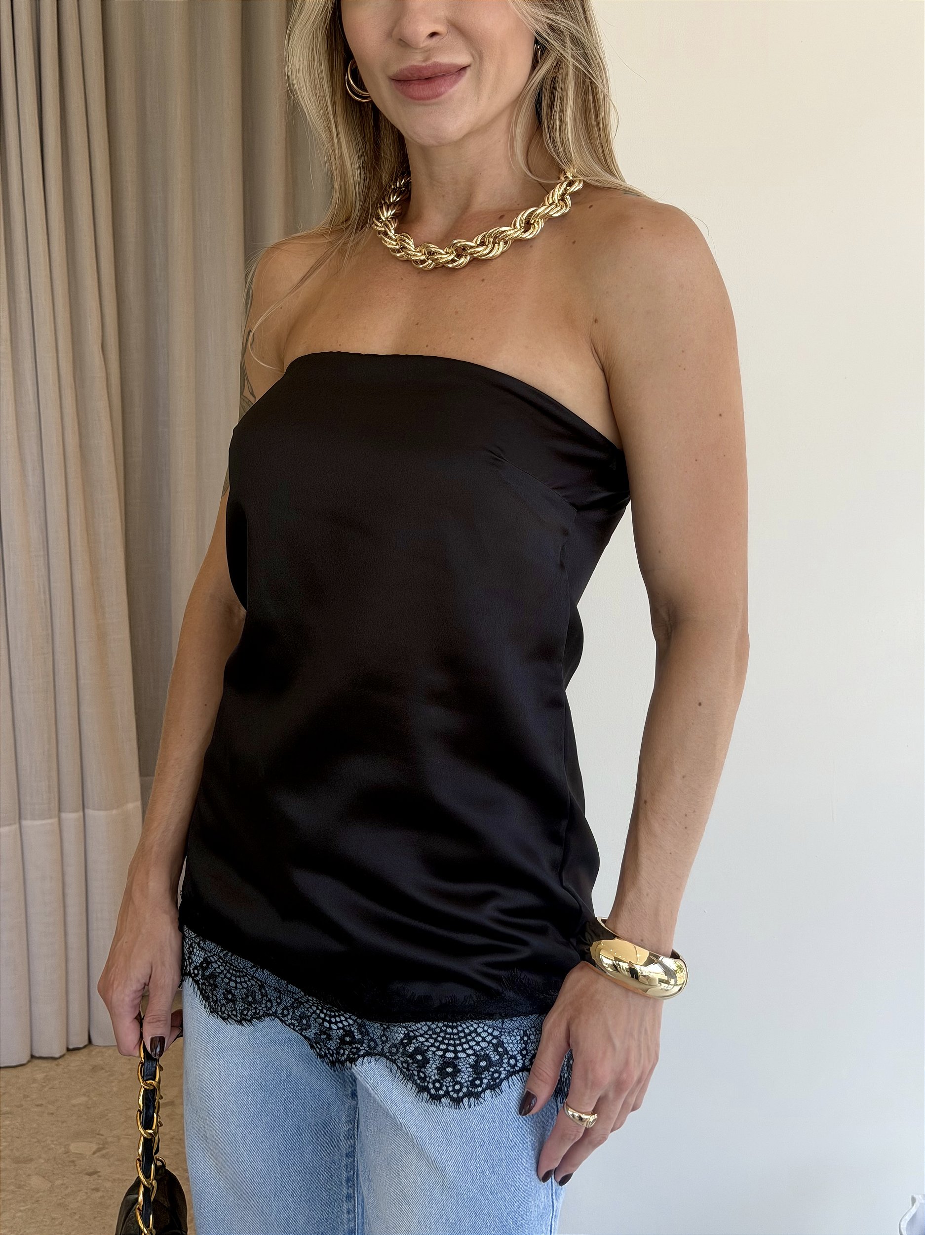 A Blusa Leandra é a peça ideal para quem busca um visual mais arrumado sem abrir mão da versatilidade. Com modelagem tomara que caia, possui elástico no busto que facilita o ajuste e garante conforto ao vestir. Confeccionada em cetim, traz um acabamento sofisticado, enquanto a barra em renda acrescenta delicadeza e charme à peça.