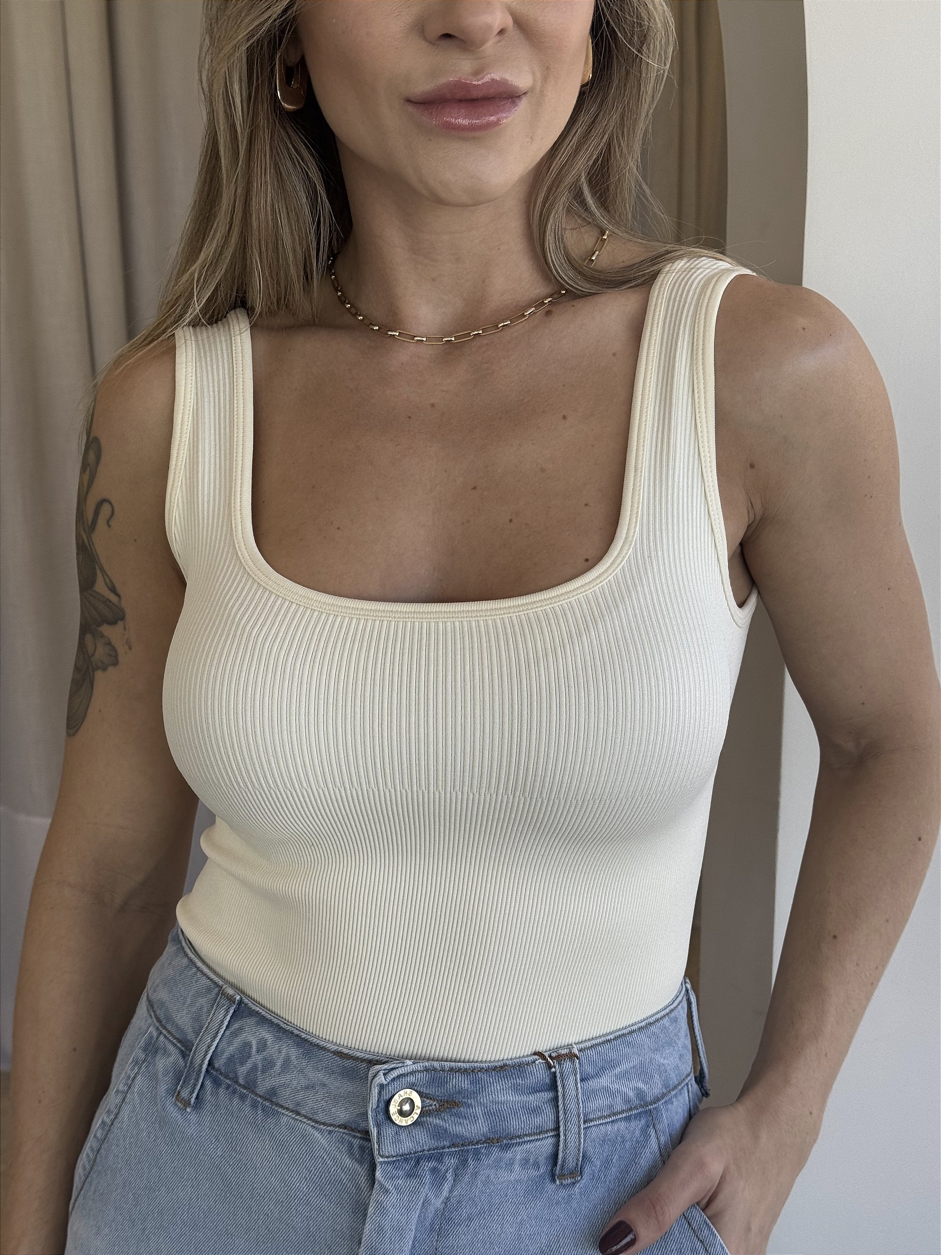 O Body Cristina é confeccionado em malha canelada de alta qualidade, oferecendo um toque macio e confortável no corpo, com boa compressão que modela a silhueta sem restringir os movimentos.