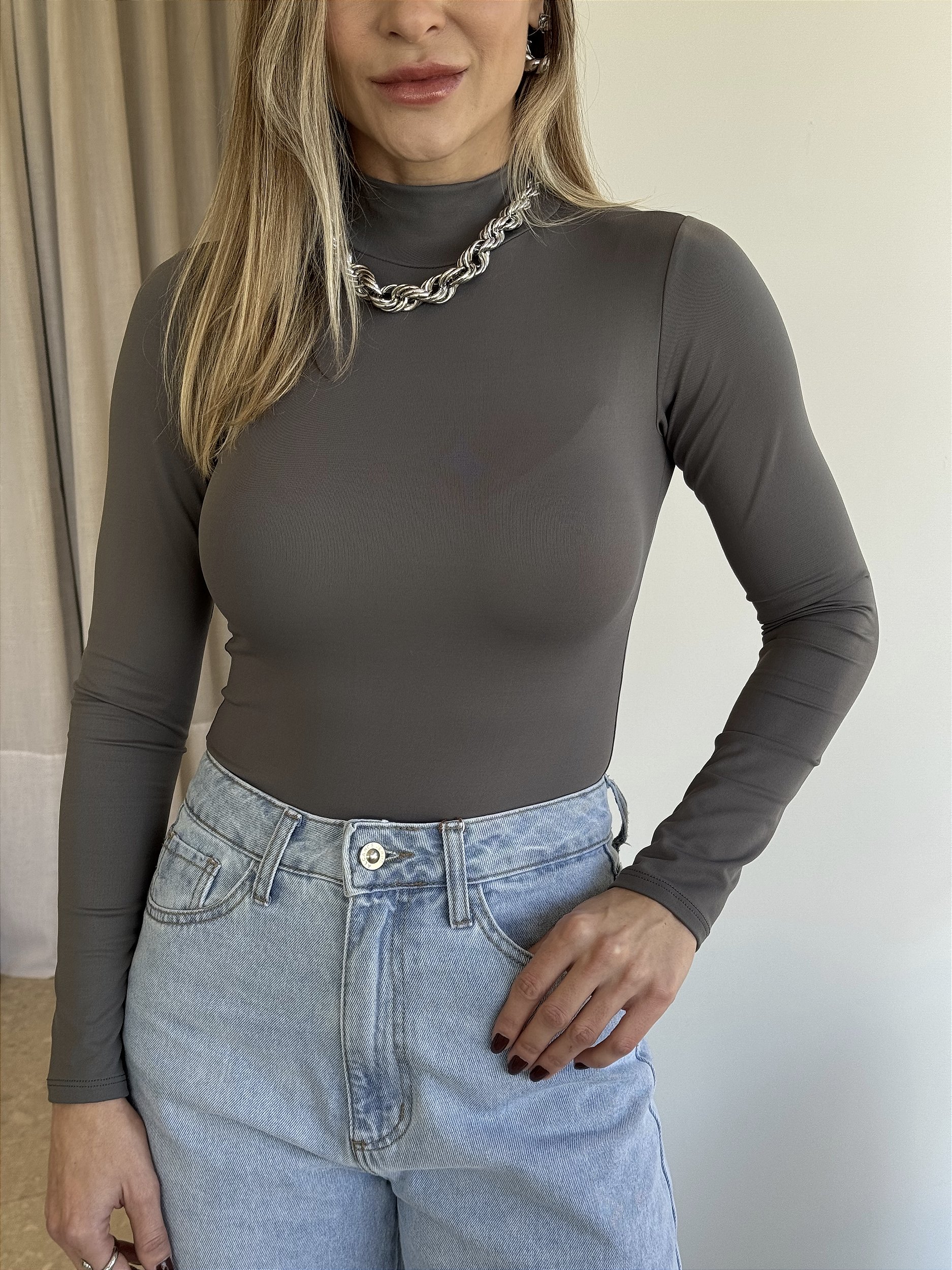 Elisabeth é um body confeccionado em poliamida, seu tecido possui elasticidade e se ajusta muito bem ao corpo, vestindo como uma segunda pele! Possui manga longa, gola alta e fechamento inferior.