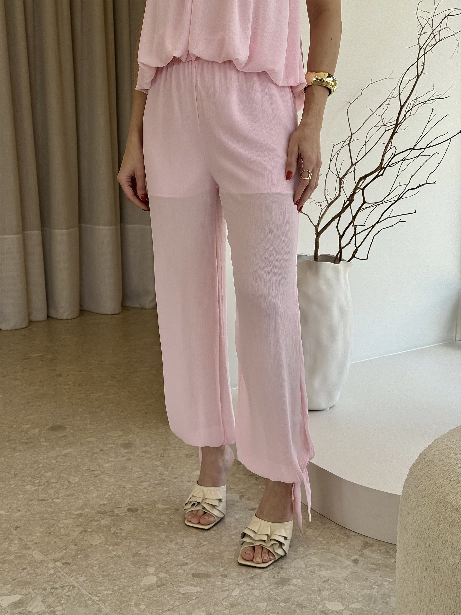 O cós com elástico na cintura garante o ajuste ideal ao corpo, enquanto o detalhe de amarração nas barras adiciona um toque moderno e diferenciado à peça. Possui forro em shorts embutido, que mantém o conforto e cria uma leve transparência nas pernas, resultando em um visual elegante e atual.