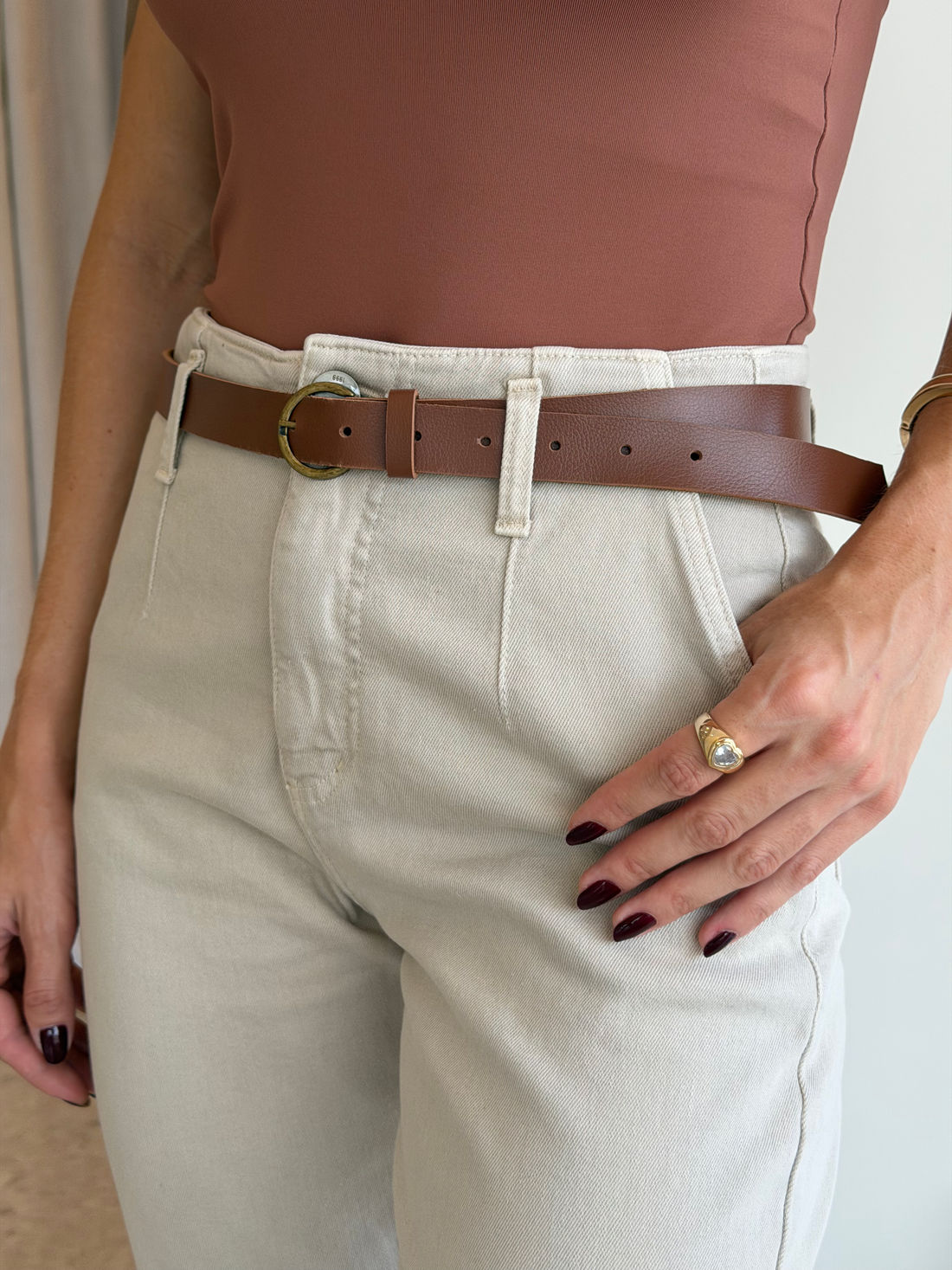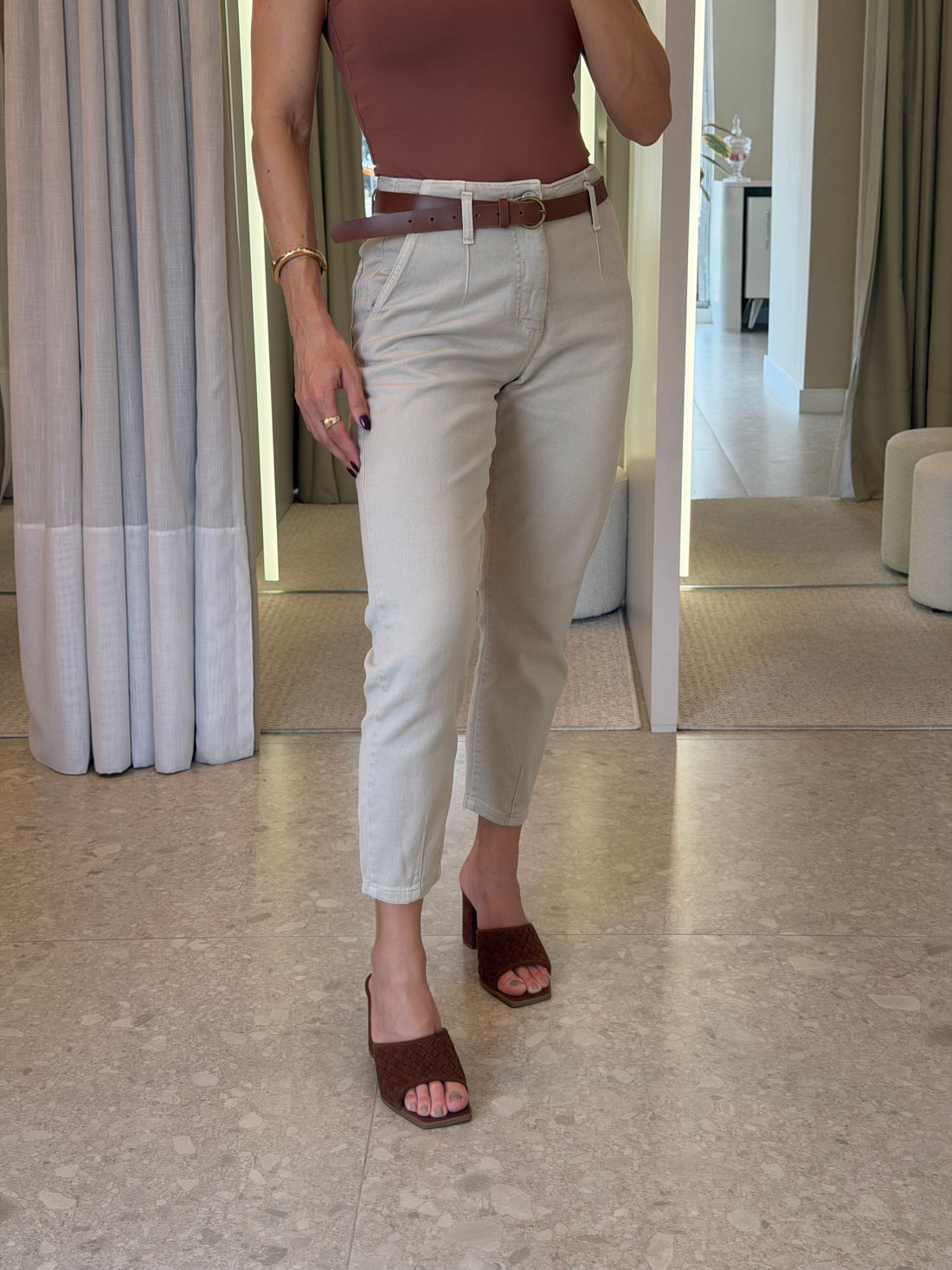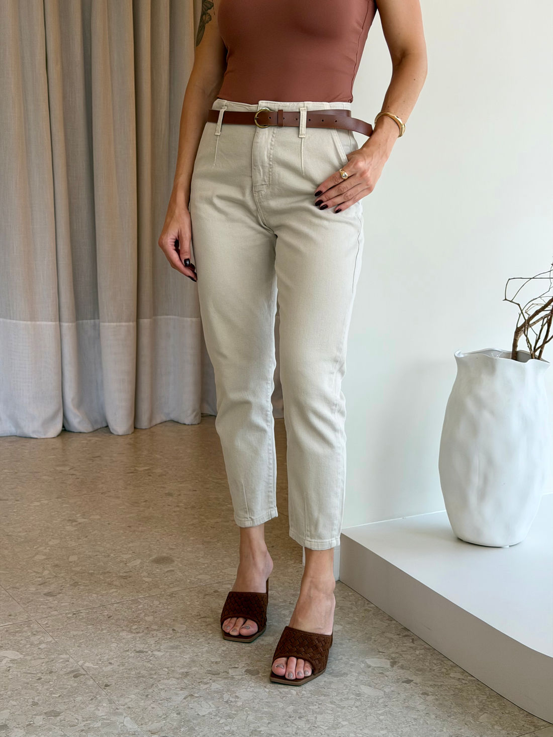 Possui cintura alta com cós e passantes, acompanhando cinto no tom marrom que agrega charme ao look. Conta com bolsos laterais e posteriores, além de fechamento frontal por zíper e botão, garantindo praticidade e ótimo caimento.