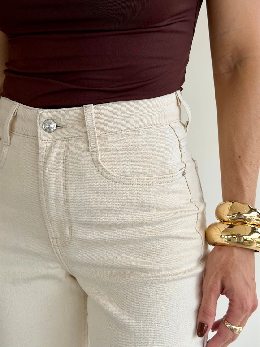 Possui cintura alta, cós com passantes e bolsos frontais e posteriores, unindo praticidade e um caimento impecável. A tonalidade bege clássica é extremamente versátil, combinando facilmente com diversas composições, do casual ao mais elegante.