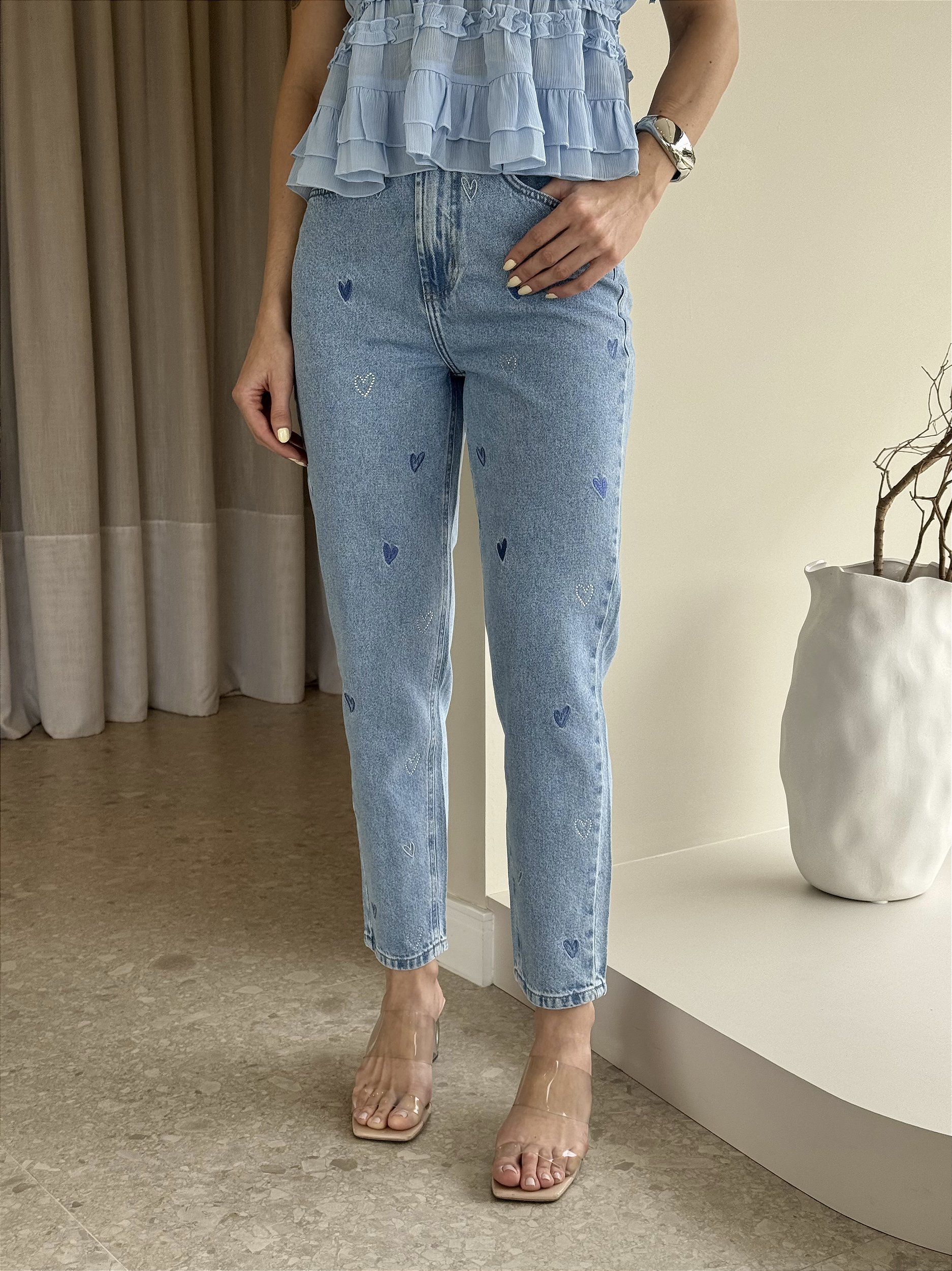 Possui cintura alta, cós com passantes, bolsos frontais e posteriores, e fechamento por zíper e botão. O grande destaque fica por conta dos corações bordados e aplicações em strass na parte frontal, que adicionam um toque delicado e feminino à peça.