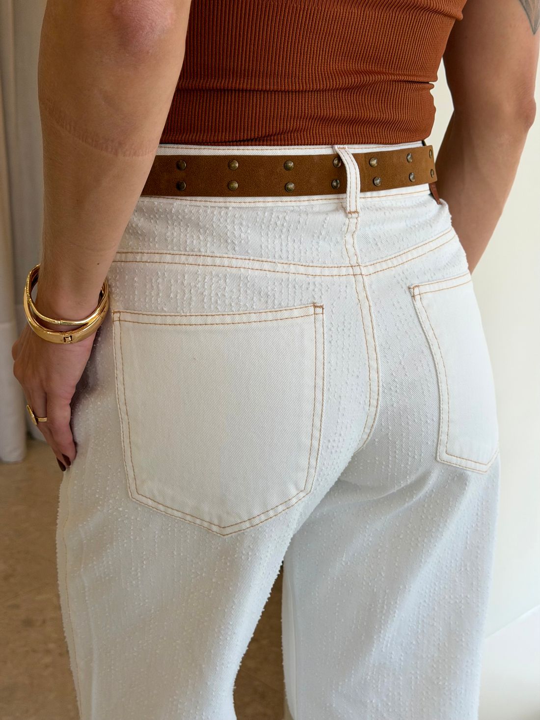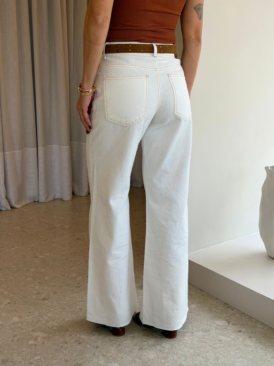 A Calça Maysa é a peça perfeita para quem busca um jeans diferenciado e cheio de estilo. Confeccionada em sarja branca, possui modelagem wide leg que garante um caimento moderno e confortável.