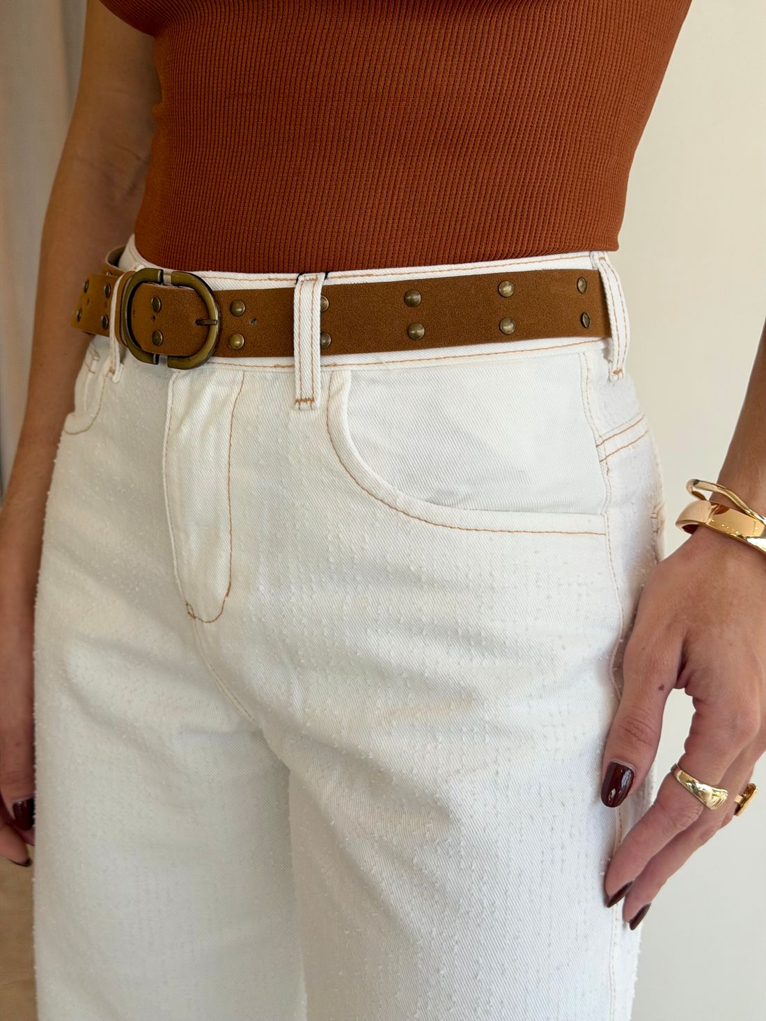 Conta com cintura alta e cós com passantes, acompanhando um cinto em camurça com aplicação de strass em tom marrom, que adiciona charme e personalidade à peça. Os detalhes destroyed ao longo da calça e os pespontos reforçam o visual despojado e atual. Possui ainda bolsos laterais e posteriores funcionais.
