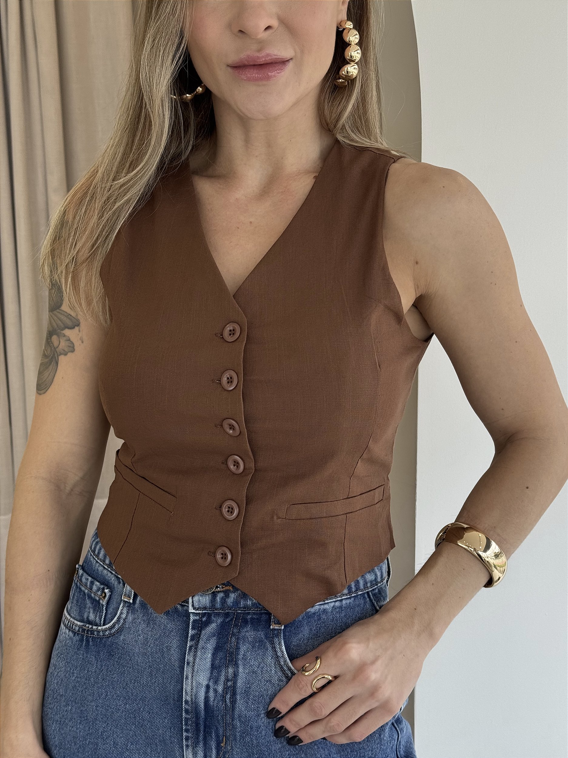 O Colete Luane é a peça curinga que eleva qualquer look na primavera/verão. Confeccionado em tecido com aspecto de linho, traz um visual leve e sofisticado, perfeito para os dias mais quentes.