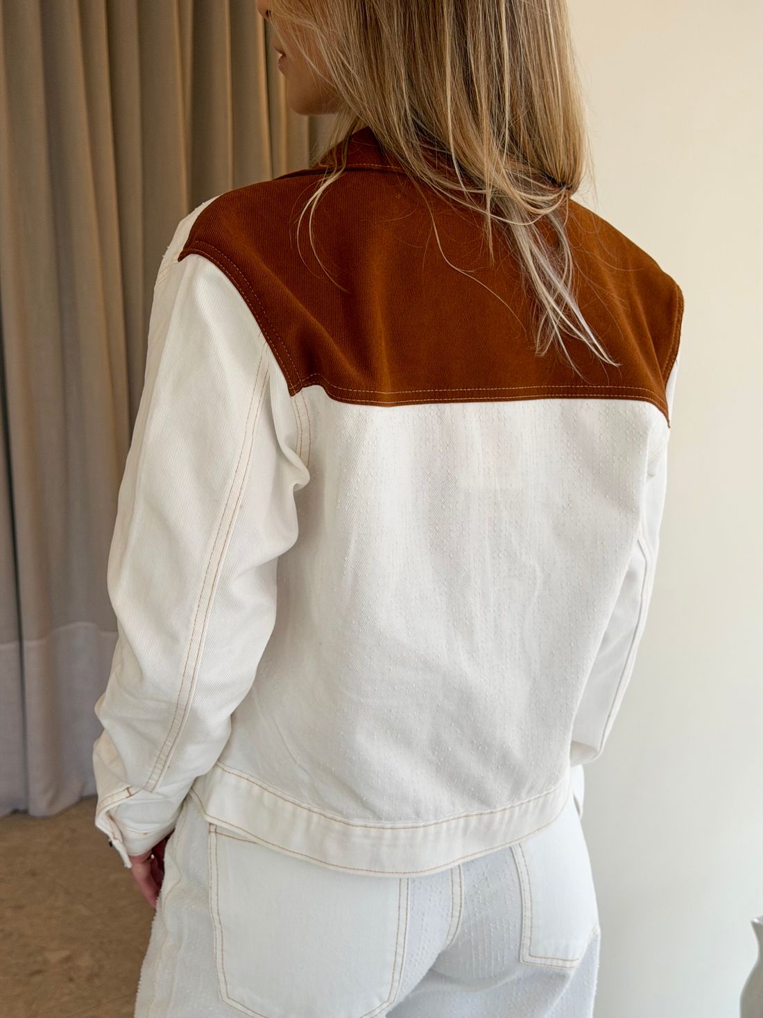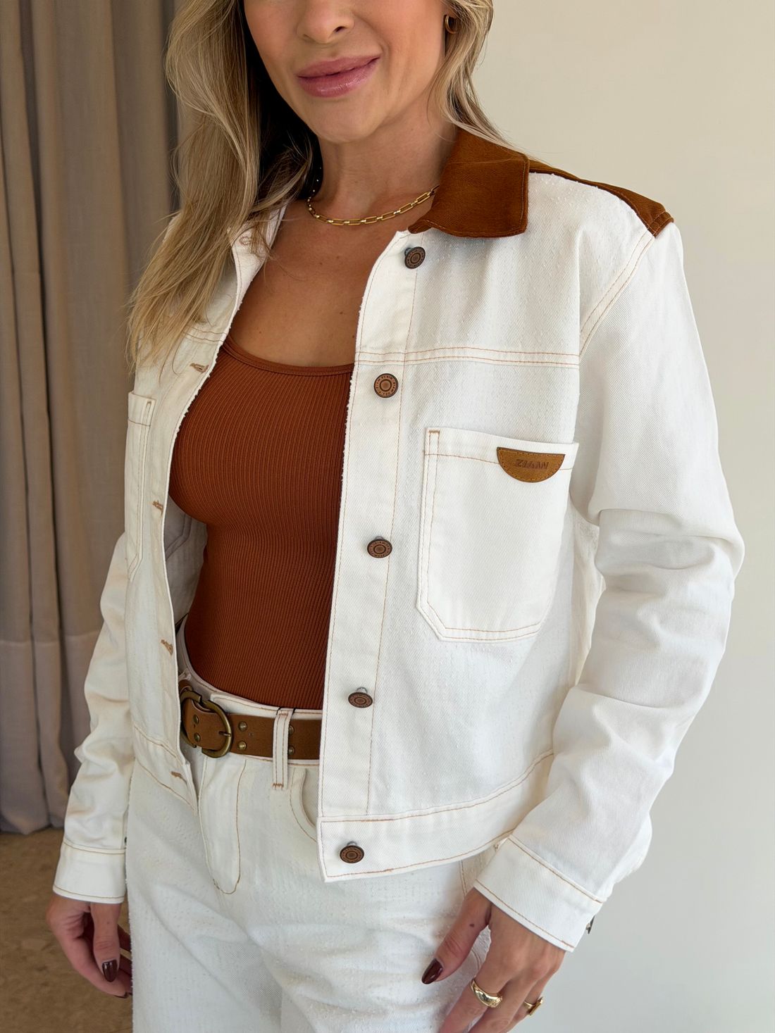 Conta com bolsos frontais funcionais e fechamento por botões, garantindo praticidade no dia a dia. O destaque fica por conta dos detalhes destroyed por toda a peça, que trazem um ar despojado e atual. A gola e a parte posterior em tecido no tom caramelo criam um contraste elegante, enquanto os pespontos reforçam o acabamento e o estilo da jaqueta.