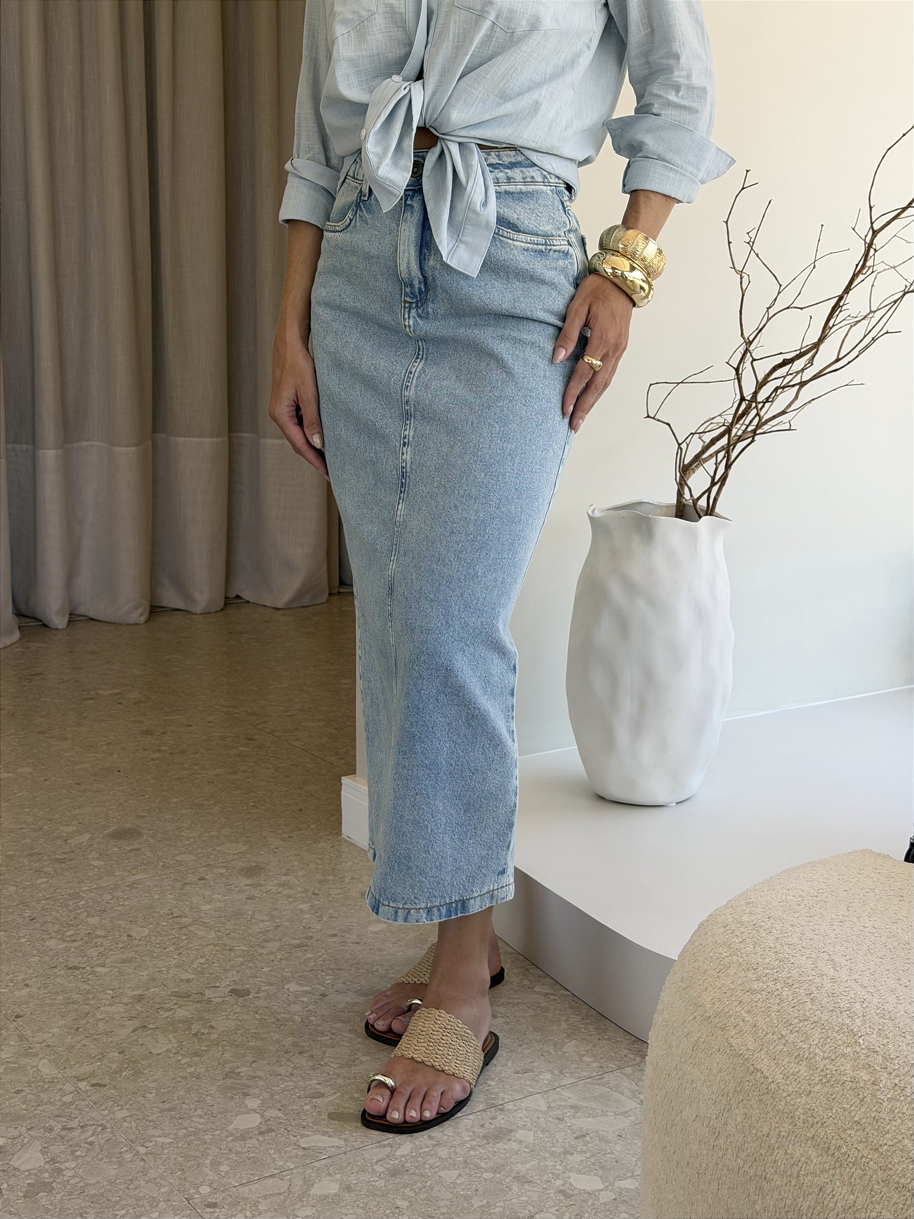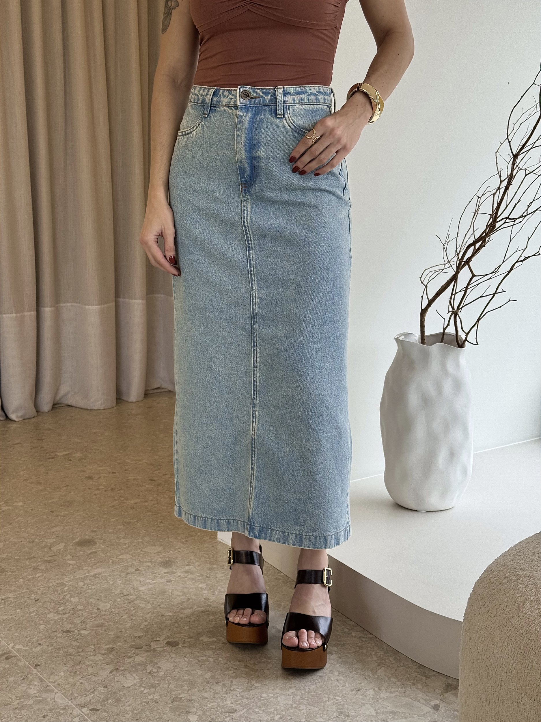 A Saia Taisa é aquele item que transforma qualquer produção. Em jeans com efeito dirty wash, traz um visual autêntico e vintage que nunca sai de moda. Seu comprimento midi garante elegância, enquanto a cintura alta com cós com passantes valoriza a silhueta.