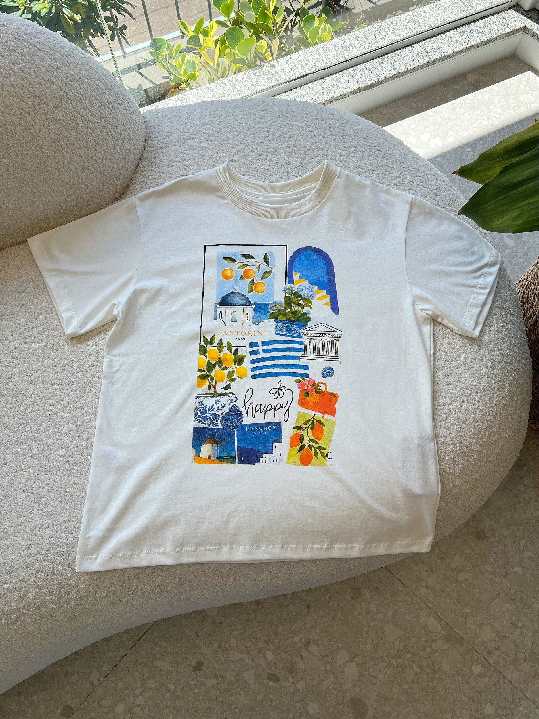 A T-Shirt Happy Greece possui modelagem mais slim no corpo. Confeccionada em algodão de toque suave, traz na parte frontal uma estampa inspirada na Grécia a cara do verão.