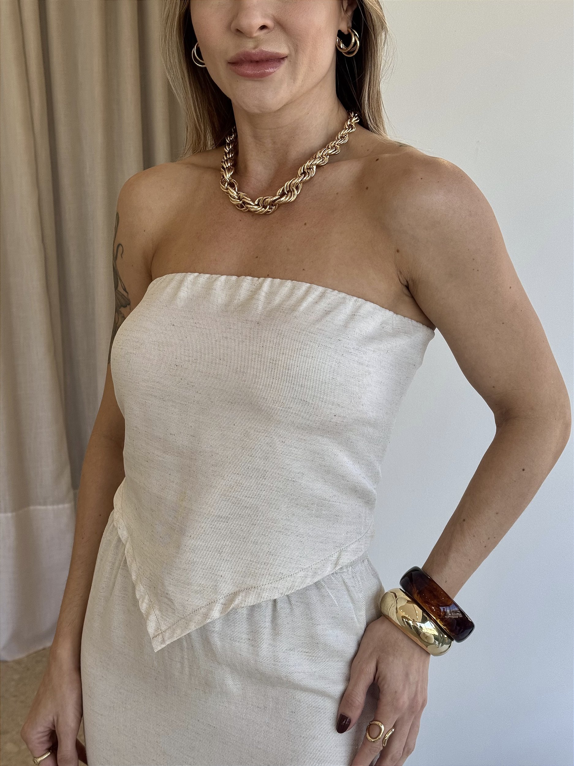 Com sua modelagem leve e fluida, é aquele tomara que caia versátil e estiloso que você vai querer usar em diferentes ocasiões — do dia descontraído ao look mais elaborado.