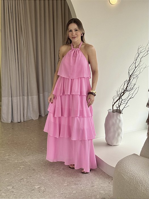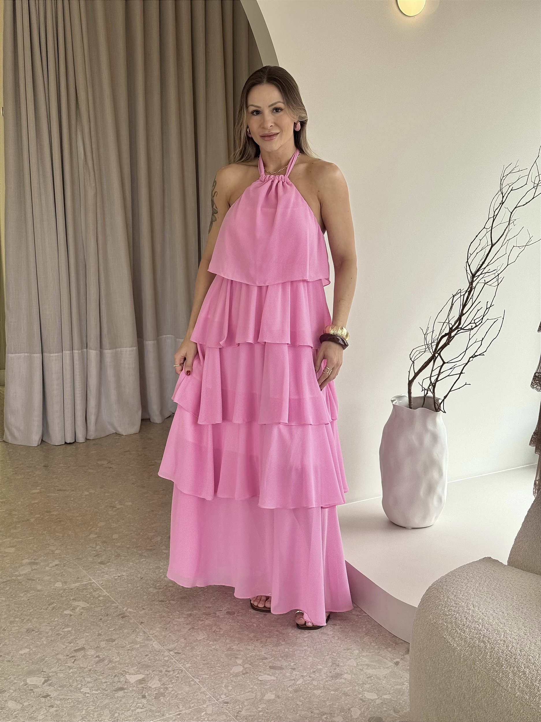 O Vestido Nastya é a definição de leveza e sofisticação. Confeccionado em chiffon fluido, seu design em camadas cria movimento e delicadeza a cada passo. O modelo traz a modernidade da frente única com amarração posterior, garantindo ajuste perfeito e charme extra.