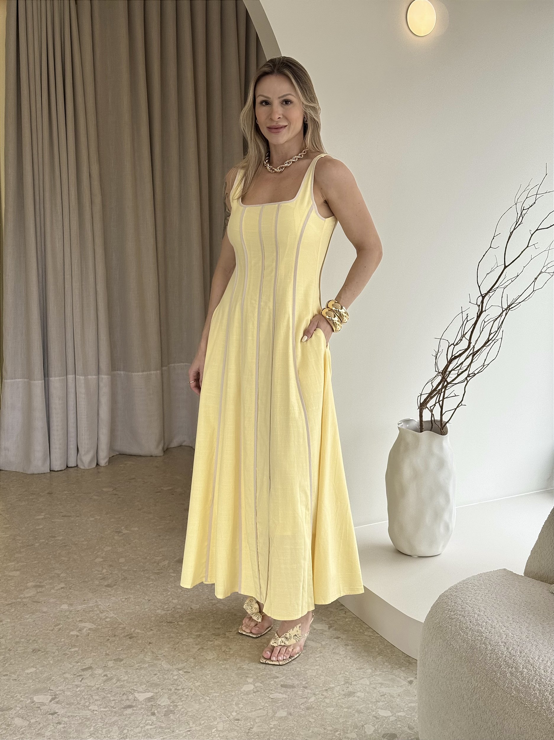 Suas alças largas com ajuste e o decote quadrado trazem um toque clássico e moderno ao mesmo tempo, enquanto o lastex posterior garante o ajuste ideal ao busto. O modelo conta ainda com bolsos laterais funcionais, forro embutido e fechamento por zíper invisível nas costas, proporcionando conforto e praticidade.