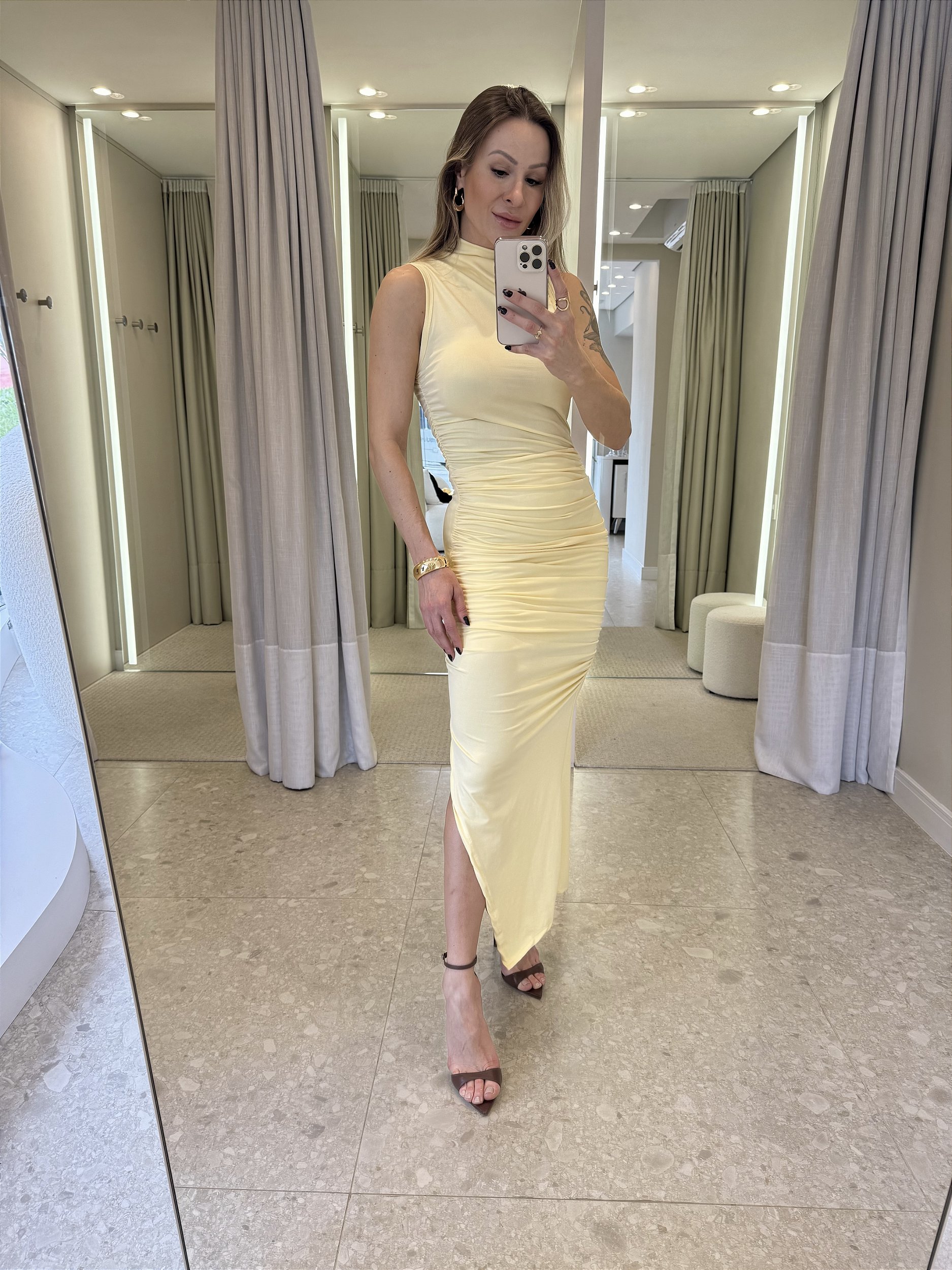 Com uma modelagem ajustada ao corpo, ele realça as curvas e cria uma silhueta poderosa. O drapeado no decote e nas laterais traz sofisticação e movimento, enquanto a fenda lateral adiciona um toque de sensualidade sutil.