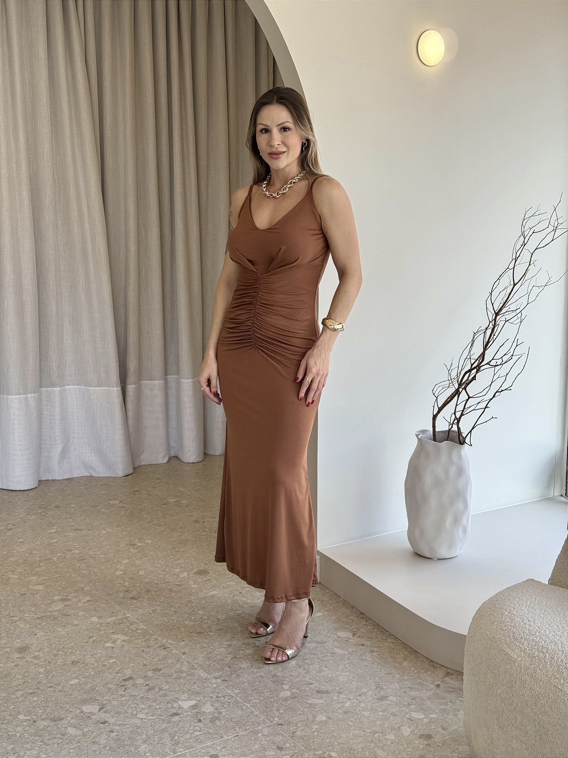 O decote em V com alças finas traz delicadeza e sensualidade na medida certa, perfeito para destacar o colo de forma elegante. Já o comprimento longo garante imponência, ideal para eventos noturnos, festas e ocasiões que pedem um look marcante.